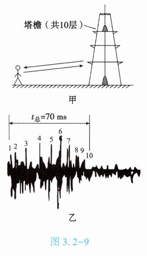 (2)为什么敲击一次石头后,人耳不能将敲击声的十声回声清晰地分辨开来,而是仅听到一声“呱呱”的声音? (塔檐回声总时间跨度$t_{总}约为70$毫秒)。
