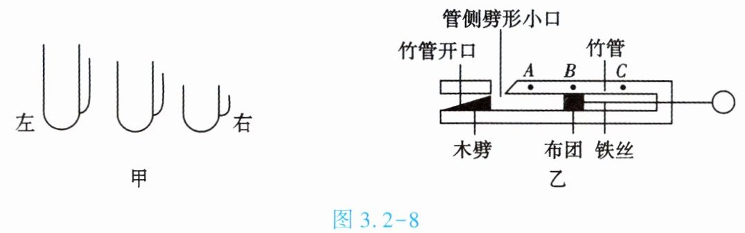 (3)小名根据实验,在课余时间制作了一个竹笛,如图$3.2 - 8$乙所示,在竹管开口处向管内吹气,并推拉铁丝环使布团处在不同位置,改变音调,吹奏歌曲。当布团分别位于$A$、$B$、$C$三个位置时,竹笛发声音调最高的位置是____,音调最低的位置是____。