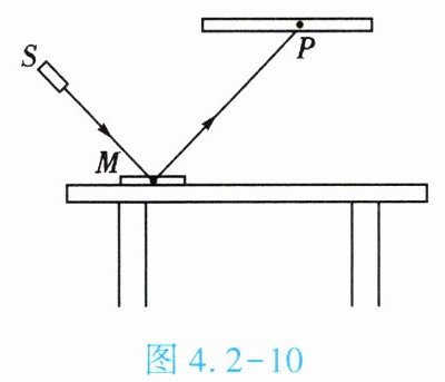 4. (★★★)如图 4.2 - 10 所示,平面镜 $ M $ 放置在水平桌面上,光源 $ S $ 发出一束激光射到镜面上,经反射后在标尺上形成光斑 $ P $,为了让光斑 $ P $ 向右移动,下列方法可行的是【 】
