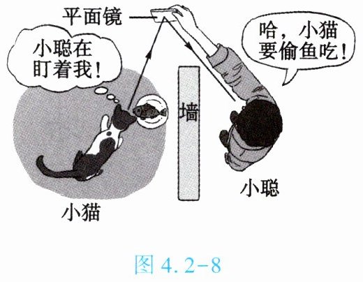 1. (★★)如图 4.2 - 8 所示是关于小猫和小聪的一幅漫画,图中两条光线的夹角是 $ 60° $,那么,小聪观察小猫的光路的入射角大小是______;小聪和小猫通过镜子能互相看到对方,说明光在反射时,光路是______的。