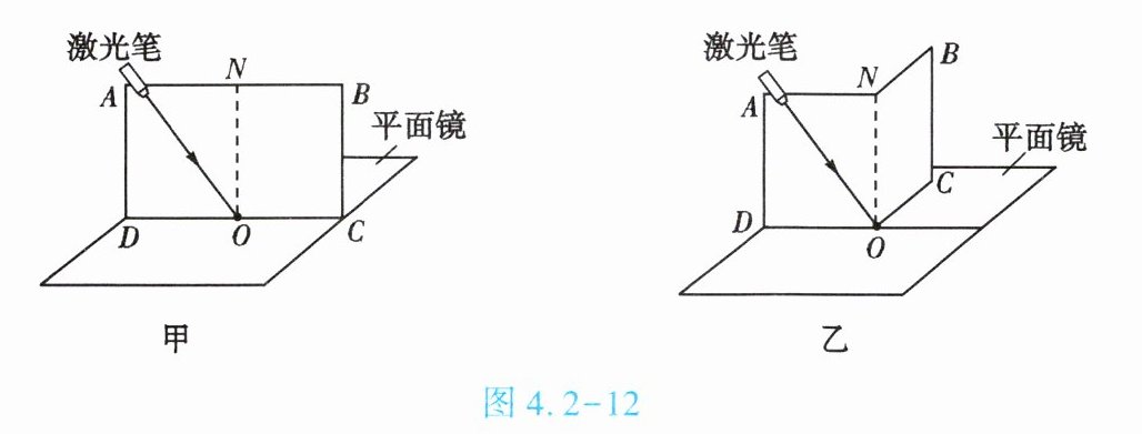 (3)如图 4.2 - 12 乙所示,将纸板右半部分绕 $ ON $ 向后翻转任意角度,发现纸板上均无反射光束呈现,此现象说明了______。