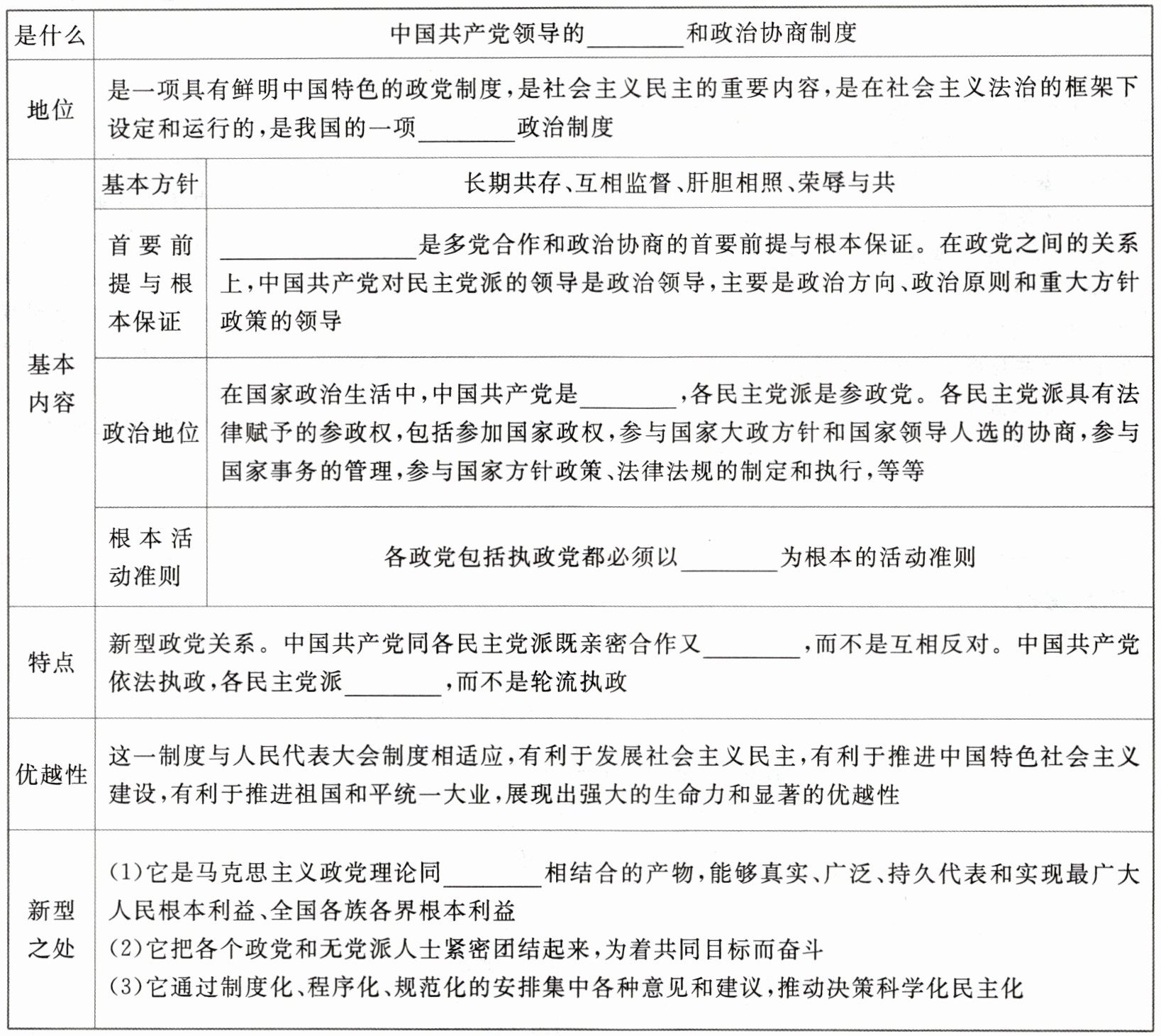 1.多党合作 基本 中国共产党的领导 执政党 宪法 互相监督 依法参政 中国实际