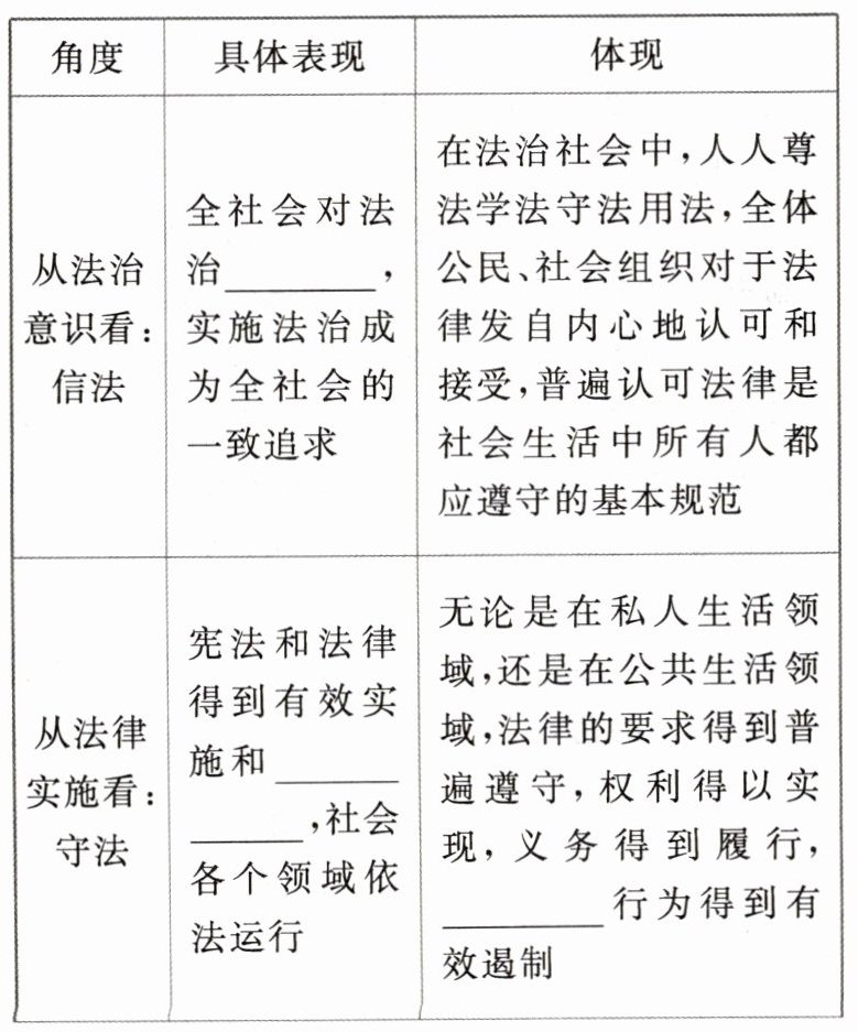 (1) 内涵:法治社会是指法律得到公认和______、社会治理依法开展、公共生活和谐有序的社会。