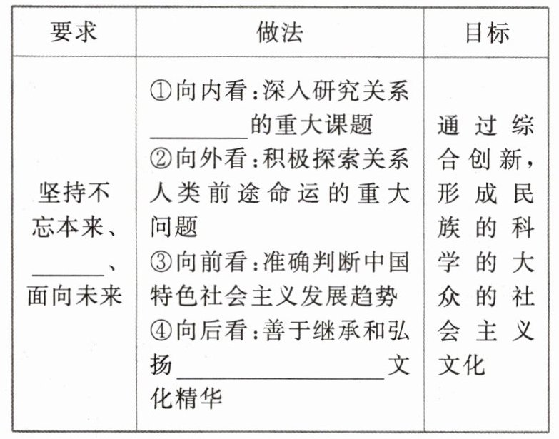 ④向后看:善于继承和弘扬________文化精华 | 通过综合创新,形成民族的科学的大众的社会主义文化 |