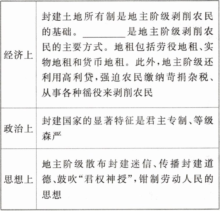 等方式,占有农民大部分劳动成果。相对于奴隶,农民有一定的人身自由,有自己的劳动工具甚至少量土地,劳动成果除缴纳地租外,还能留下一部分归自己支配。地主阶级剥削农民的方式