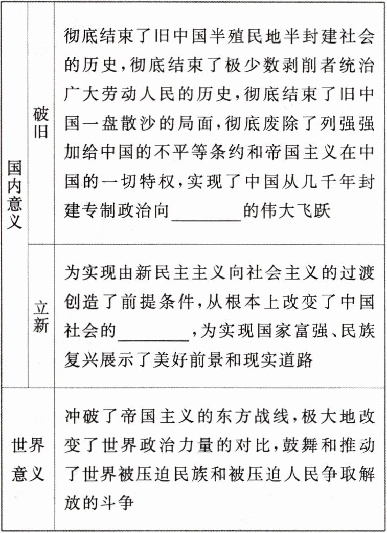 2.中华人民共和国的成立,彻底结束了旧中国半殖民地半封建社会的历史。十月革命建立了世界上第一个社会主义国家,实现了社会主义从理论、运动到实践、制度的伟大跨越。