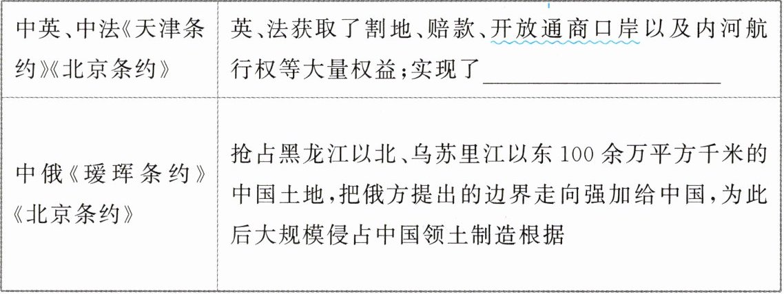 2. 进程:1856 年,英法发动战争,美俄调停;1858 年,签订《天津条约》;1860 年,火烧圆明园,签订《北京条约》。