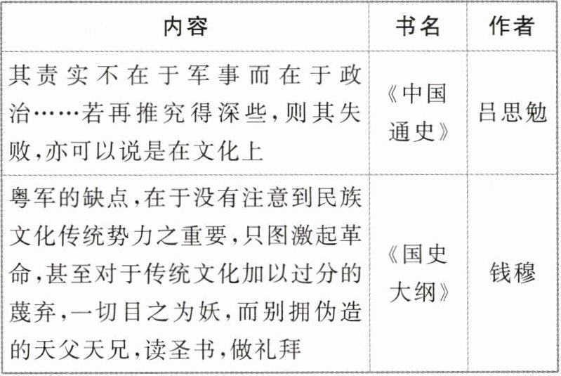 1.C 据材料“亦可以说是在文化上”“在于没有注意到民族文化传统势力之重要”可知表中学者分析太平天国运动失败的原因是文化上的不足,认为其缺乏科学理论的指导,故选C项;未能顺应历史潮流与材料主旨不符,排除A项;动摇了正统思想统治地位的是新文化运动,排除B项;农民阶级的局限性是太平天国运动失败的根本原因,深受西方文明影响的说法错误,排除D项。