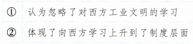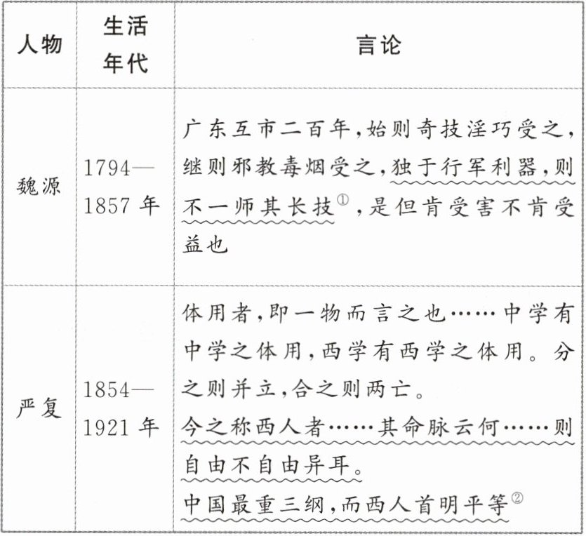 魏源:西方列强入侵,清政府对西方文明缺乏正确的认识,鸦片战争中国战败;提出“师夷之长技以制夷”。严复:洋务派学习西方停留在器物层面,甲午中日战争战败,洋务运动破产;主张自由平等,学习西方的政治制度。