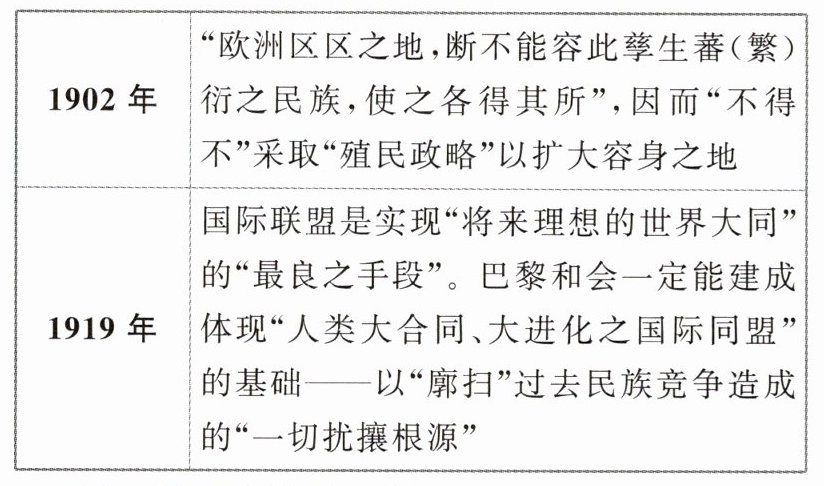 1.D 据题干可知,梁启超十分关注第一次世界大战前后欧洲列强间的关系,不仅分析“(欧洲)各国竞争的起因”,还思考了“世界大同”的道路,可见面对民族危机,梁启超分析了列强侵略中国的原因,并从世界范围的角度来思考救国方案,故选D项;“经济援助”不合题意,排除A项;社会改造在材料中并未体现,排除B项;材料没有体现君主立宪,排除C项。