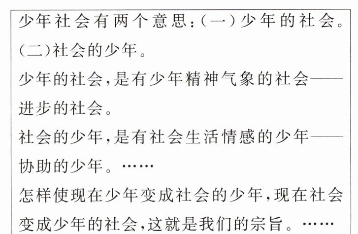 3.B 题干述及的时间是1919年,即新文化运动后期,图片内容是《少年社会》的创刊宣言,即创刊的目的,据图片内容可知,该刊物要塑造“有社会生活情感的少年”和“进步的社会”,这表明该刊编者认识到人的解放和社会改造是时代使命,故选B项;互助协作是培养“有社会生活情感的少年”的手段,而不是“挽救民族危亡”的手段,排除A项;题干虽然述及了“少年的社会”及“社会的少年”,但是并没有述及新少年在新社会中国所宣传的具体内容,排除C项;理性觉醒和教育革新是塑造新少年和新社会的途径,而不是“前提”,排除D项。