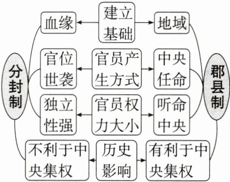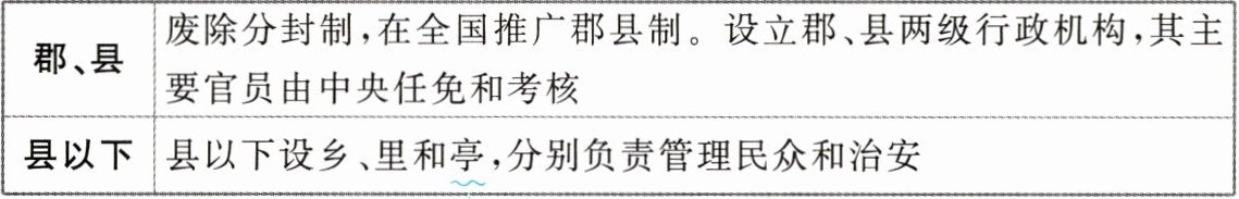 秉承皇帝旨意,统领众官;太尉是最高武官,掌军事;御史大夫协理国政,掌管图籍、文书,是最高监察官。九卿下设若干部门,处理具体事务。【链接·选择性必修1】③郡县制②