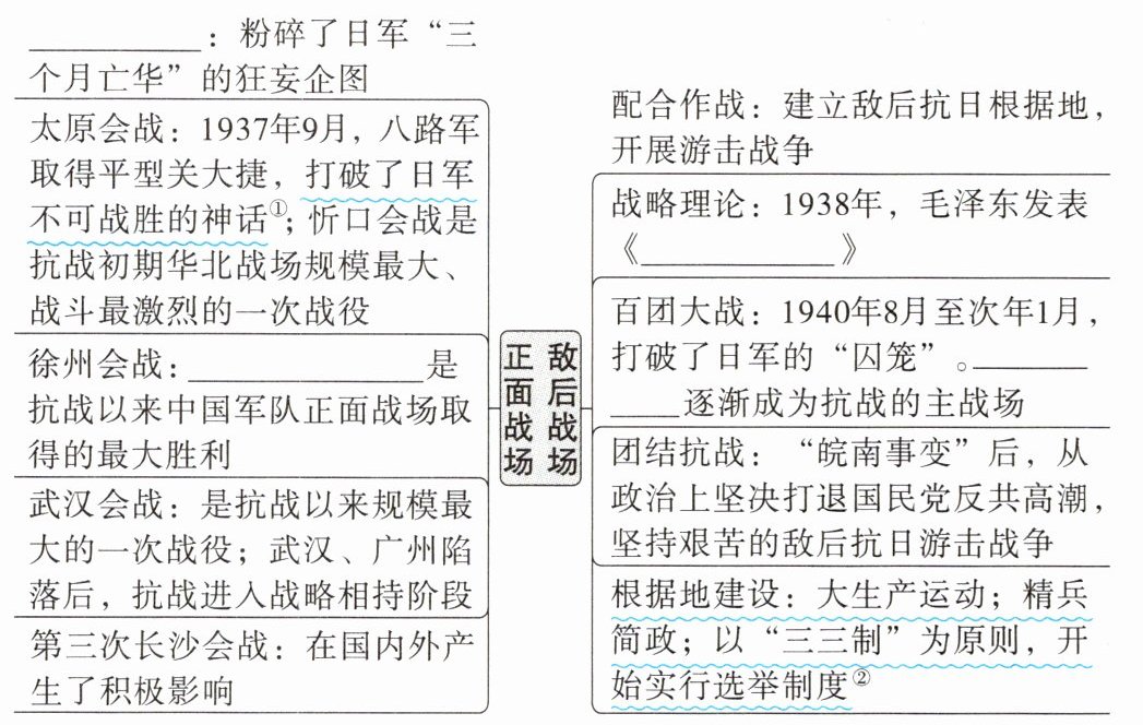 1.淞沪会战 台儿庄大捷 论持久战 敌后战场 2.抗日民主 3.