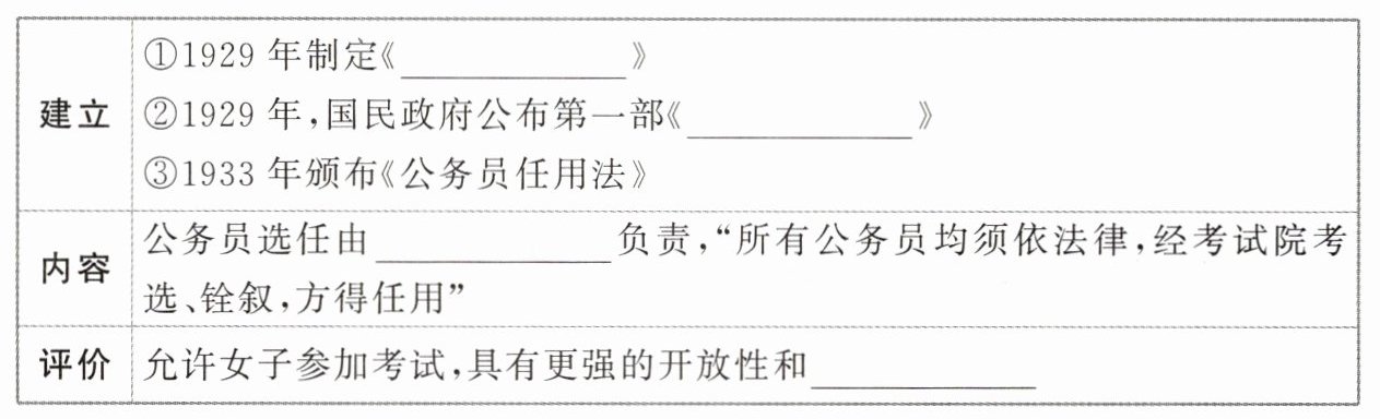 (1)考试制度:1913年颁布了《文官考试法草案》等法案,标志着