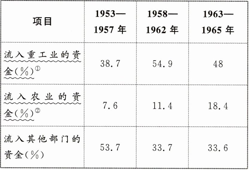 (2) 根据材料二并结合所学知识,分别说明与前一个阶段相比,1963—1965年我国资金在重工业和农业领域流动的变化及其原因。