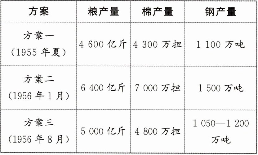 材料一 下表是为提交中共八大开会讨论,中央有关部门先后提出的三份“二五”计划方案中,粮、棉、钢产量在1962年应达指标。