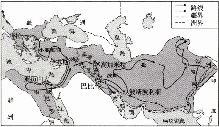 2.C 从地图的“路线”演进看,该路线是亚历山大远征的路线,亚历山大远征促进了希腊文化与东方文化的融合,开启了希腊化时代,C项正确;传播了阿拉伯数字、加快了印刷术西传进程的都是阿拉伯帝国,A、D两项错误;马其顿帝国统治时期,罗马法仍然是公民法,适用范围狭小,B项错误。