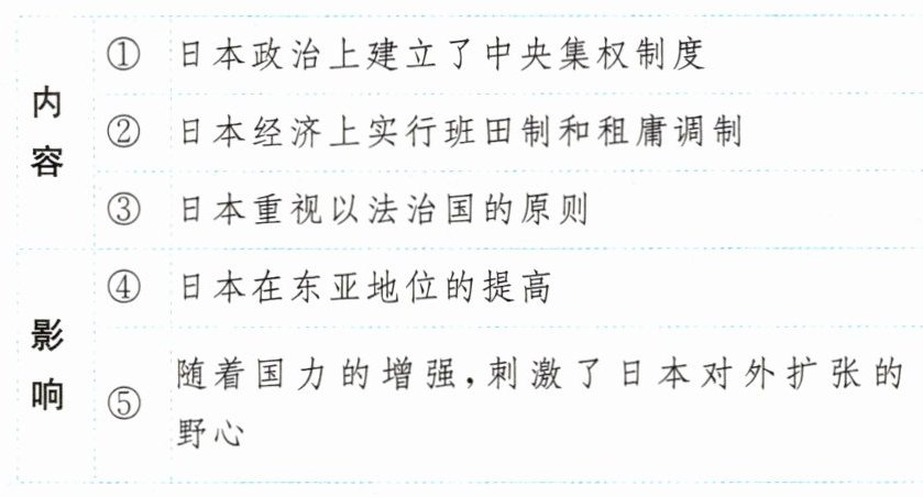 内容:政治上,建立中央集权制,确定了以法治国的原则。经济上,推行班田制和租庸调制,建立封建剥削关系。文化上,全面学习中国的儒家文化。影响:日本由奴隶社会过渡到封建社会;在儒家文化圈的地位提高;刺激了其对外扩张的野心。