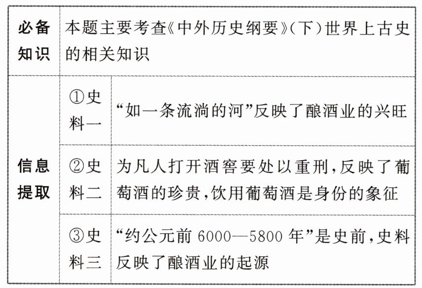 史料一:反映了古代西亚两河流域酿酒业的发展,推断出当时葡萄种植业的发展推动了当地酿酒业的兴旺,葡萄酒成为人们的日常饮料。
