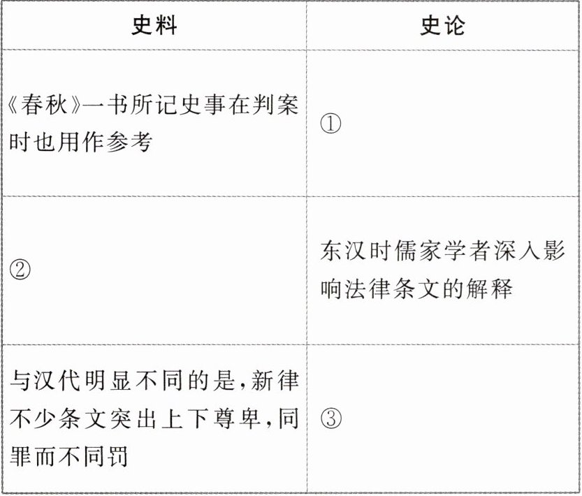 【思考】 根据材料,围绕“儒学对西汉、东汉、魏晋时期法律的影响”,建立史料与史论的联系。