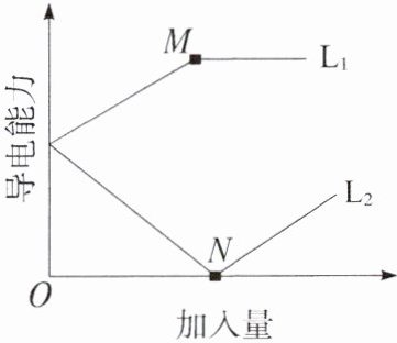 2.B 解析 加入$Ba(OH)_2$溶液,则$Ba(OH)_2 + CuSO_4 = BaSO_4 \downarrow + Cu(OH)_2 \downarrow$,当二者恰好完全反应时,溶液中几乎没有自由移动的离子,导电性接近0,故线$L_1$表示加入$CuSO_4$固体,线$L_2$表示加入$Ba(OH)_2$溶液,A正确;M点前溶液质量逐渐增大,M点后为饱和溶液,再加入$CuSO_4$不溶解,会析出$CuSO_4 \cdot 5H_2O$,仍为饱和溶液,但溶液质量减少,B错误;M点前为不饱和溶液,M点后变为$CuSO_4$的饱和溶液,C正确;N点时$CuSO_4$和$Ba(OH)_2$恰好1:1反应,离子方程式为$Cu^{2+} + SO_4^{2-} + Ba^{2+} + 2OH^- = BaSO_4 \downarrow + Cu(OH)_2 \downarrow$,D正确。