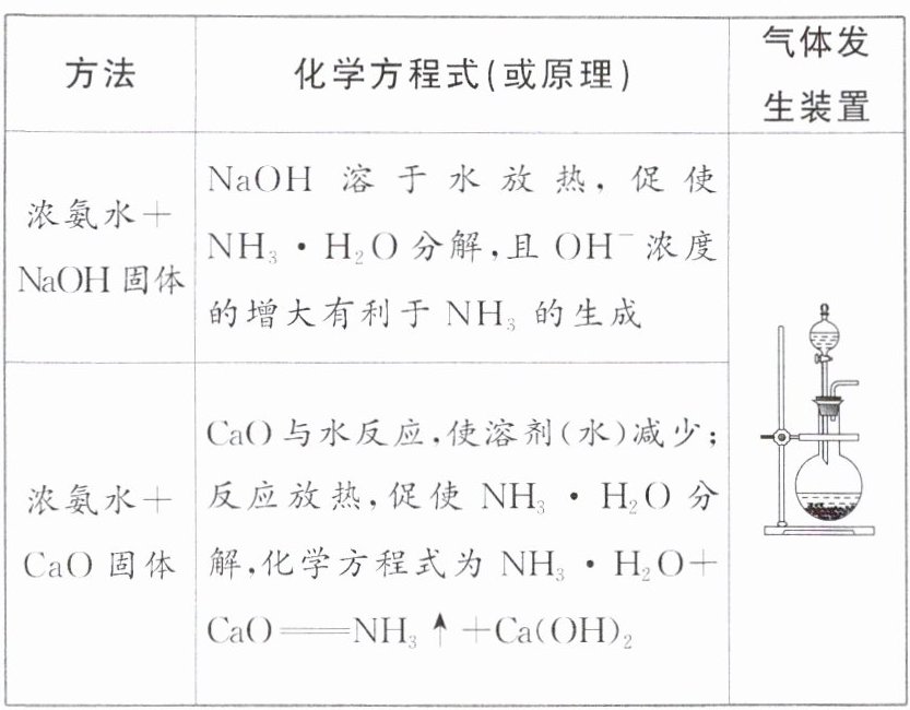 | 浓氨水+$NaOH$固体 | $NaOH$溶于水放热,促使$NH_3\cdot H_2O$分解,且$OH^-$浓度的增大有利于$NH_3$的生成 | 与插图2中装置相同(液态与固态不加热制气体装置,分液漏斗中盛放浓氨水,圆底烧瓶中盛放$NaOH$固体) |