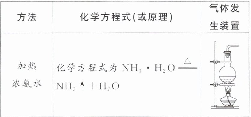 | 加热浓氨水 | 化学方程式为$NH_3\cdot H_2O\xlongequal{\triangle}NH_3\uparrow +H_2O$ | 与插图1中装置相同(固体(液体)加热制气体装置) |