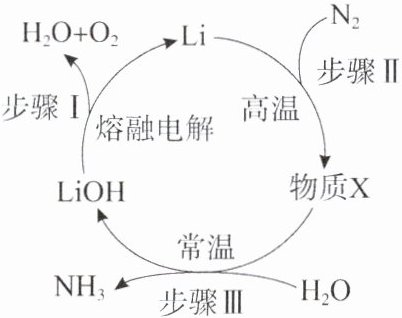 4.D 解析 步骤Ⅱ中Li和N₂反应生成Li₃N,氮元素由单质变为化合物,因此属于氮的固定,A正确;LiOH先消耗后生成,LiOH可视为该历程中的催化剂,B正确;反应物为氮气和水,产物为氨气和氧气,LiOH为催化剂,由电子守恒和原子守恒可得总反应为2N₂+6H₂O══4NH₃+3O₂,C正确;该反应历程中步骤Ⅰ是通过电解发生的,并非通常条件下进行的反应,不能说明N₂的氧化性强于O₂,D错误。
