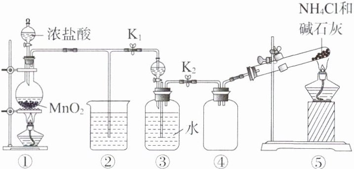 对点训练2 B 解析 由图可知,①中发生的反应为MnO₂ + 4HCl(浓$)\overset{\triangle}{=}MnCl₂ + Cl₂↑ + 2H₂O,$打开K₁,Cl₂能和NaOH溶液反应生成NaCl、NaClO,⑤用来制取NH₃,④装置作安全瓶,能防倒吸,在③中NH₃和NaClO反应生成N₂H₄,发生反应ClO⁻ + 2NH₃ = N₂H₄ + Cl⁻ + H₂O,最后关闭K₁,②中盛装NaOH溶液,用于吸收多余的Cl₂。装置①中浓盐酸换成H₂O₂,制备氧气时不需要加热,MnO₂作催化剂,A错误;Cl₂有毒,不能排放在环境中,则②中盛装NaOH溶液,用于吸收多余的Cl₂,B正确;③分液漏斗中应该盛装NaOH溶液,利用Cl₂与NaOH溶液反应制备NaClO,C错误;反应结束后,关闭K₂,多余的NH₃可收集在④中,但NH₃中混有水蒸气,D错误。