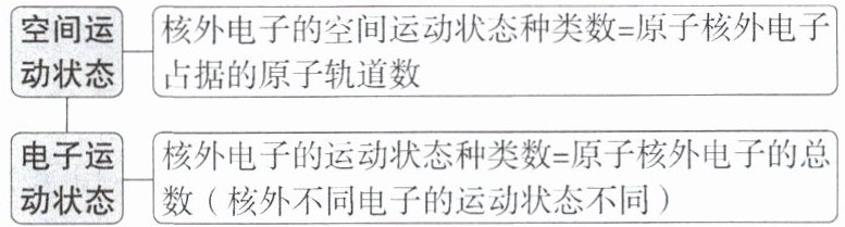 $\begin{cases} 空间运动状态:核外电子的空间运动状态种类数 = 原子核外电子占据的原子轨道数 \\ 电子运动状态:核外电子的运动状态种类数 = 原子核外电子的总数(核外不同电子的运动状态不同) \end{cases}$