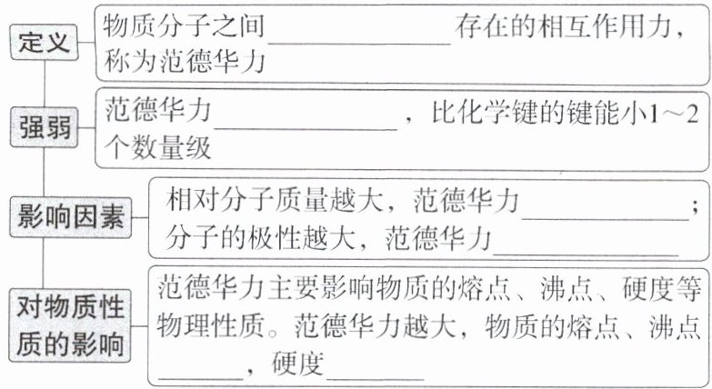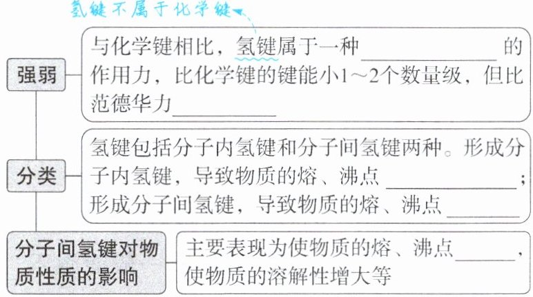 - 分子间氢键对物质性质的影响:主要表现为使物质的熔、沸点升高,使物质的溶解性增大等。