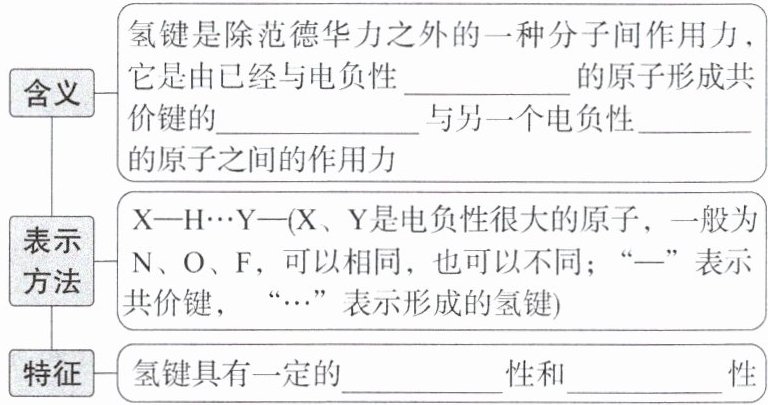 - 含义:氢键是除范德华力之外的一种分子间作用力,它是由已经与电负性很大的原子形成共价键的氢原子与另一个电负性很大的原子之间的作用力。