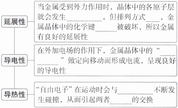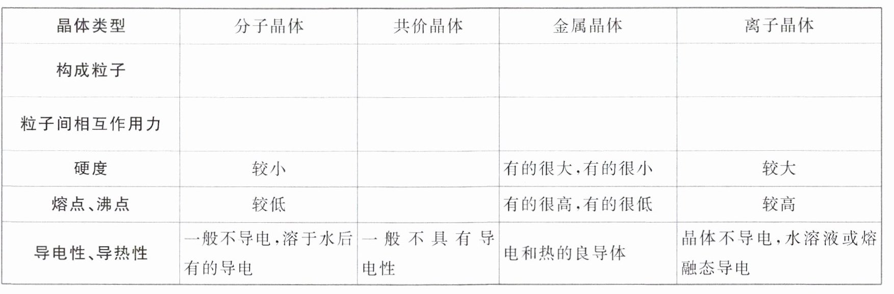 1.分子 原子 金属阳离子和自由电子 阴、阳离子 分子间作用力 共价键 金属键 离子键