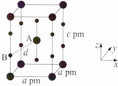 ;晶胞中$A$、$B$间距离$d =$$\frac{1}{2}\sqrt{2a^{2}+(c - 2r)^{2}}$