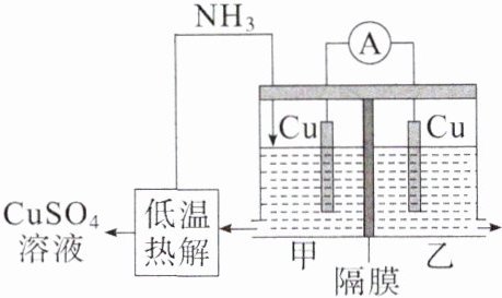5. (2023·山东卷,11 改编)利用热再生氨电池可实现$ CuSO_4 $电镀废液的浓缩再生。电池装置如图所示,甲、乙两室均预加相同的$ CuSO_4 $电镀废液,向甲室加入足量氨水后电池开始工作。下列说法错误的是(