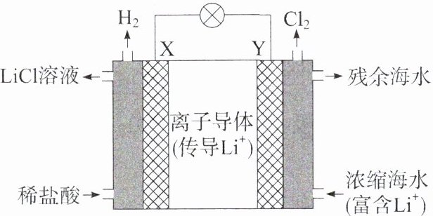 4.A 解析 加入盐酸,X极上生成氢气,$H^+$发生还原反应:$2H^+ + 2e^- \longrightarrow H_2 \uparrow$,X极为正极,Y极上$Cl^-$发生氧化反应:$2Cl^- - 2e^- \longrightarrow Cl_2 \uparrow$,Y极是负极,电池工作时,$Li^+$向X极区移动,A项错误、C项正确;在外电路中电流由正极流向负极,B正确;Y极每生成1mol$Cl_2$,转移2mol电子,有2mol$Li^+$向正极移动,则X极区得到2mol$LiCl$,D正确。