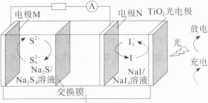 2.B 解析 由图中信息知,放电时,电极N为正极,L得电子变成I⁻,反应式为$I_3^- + 2e^- \longrightarrow 3I^-$;电极M为负极,$S^{2-}$失去电子变为S,电极反应式为$4S^{2-} - 6e^- \longrightarrow S_4$;$Na^+$从M极向N极移动;充电时阳极的反应为$3I^- - 2e^- \longrightarrow I_3^-$;阴极反应为$S^{2-} + 6e^- \longrightarrow 4S^{2-}$;光照可促进电子的转移,据此分析。由上述分析可知,放电时,电极N为正极,电极M为负极,电极N上的电势高于电极M上的电势,A正确;由分析可知,放电时,$Na^+$由M电极区移入N电极区,B错误;充电时,光可以促进$I^-$在$TiO_2$光电极上转移电子,C正确;充电时,阳极上$I^-$失电子转化为$I_3^-$,电极反应式为$3I^- - 2e^- \longrightarrow I_3^-$,D正确。