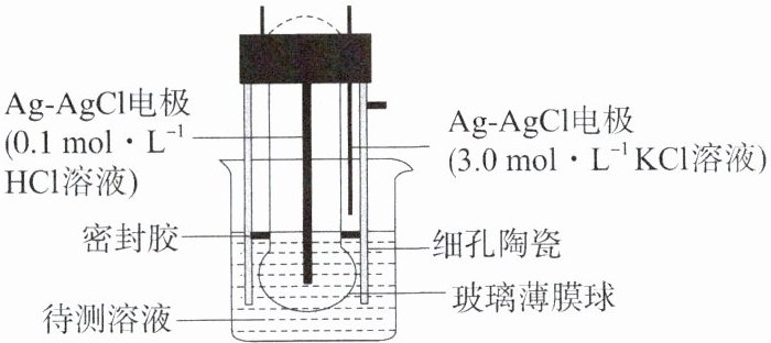 3. (2022·浙江 1 月选考卷)${pH}$计是一种采用原电池原理测量溶液${pH}$的仪器。如图所示,以玻璃电极(在特制玻璃薄膜球内放置已知浓度的${HCl}$溶液,并插入${Ag - AgCl}$电极)和另一${Ag - AgCl}$电极插入待测溶液中组成电池,${pH}$与电池的电动势$E$存在关系:${pH}=(E - 常数)/0.059$。下列说法正确的是(