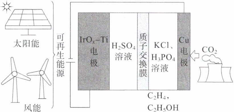 例3 C 解析:本题考查电解原理治理$CO_2$,涉及电极产物、离子移动、电极方程式的正误判断和电化学计算。根据电还原$CO_2$可知$IrO_x - Ti$电极为电解池阳极,$Cu$电极为电解池阴极。析氢反应发生在阴极($Cu$电极)上,A项错误;质子交换膜只允许两极区转移$H^+$,B项错误;$2CO_2 + 12e^- \longrightarrow C_2H_4$,结合$H_2SO_4$溶液和电荷守恒可知阴极反应有$2CO_2 + 12H^+ + 12e^- \longrightarrow C_2H_4 + 4H_2O$,C项正确;阳极反应为