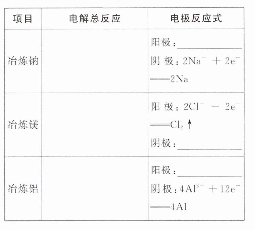 |冶炼镁|$MgCl_2(熔融) \stackrel{电解}{=\!=\!=} Mg + Cl_2\uparrow$|阳极:$2Cl^{-} - 2e^{-}\xlongequal{}Cl_{2}↑$