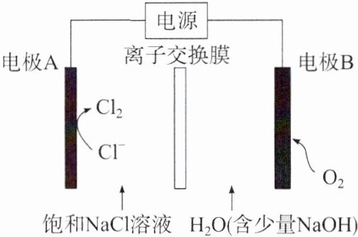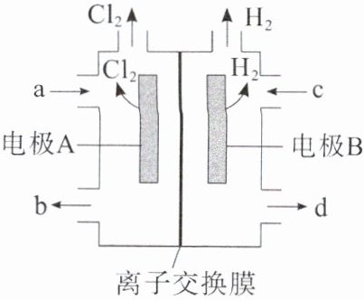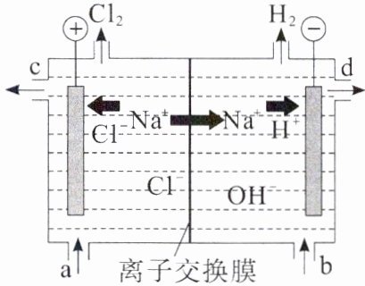 情境思考 --> 氯碱工业以电解精制饱和食盐水的方法制取氯气、氢气、烧碱和氯的含氧酸盐等系列化工产品。如图是离子交换膜法电解食盐水的示意图,图中的离子交换膜只允许阳离子通过。
