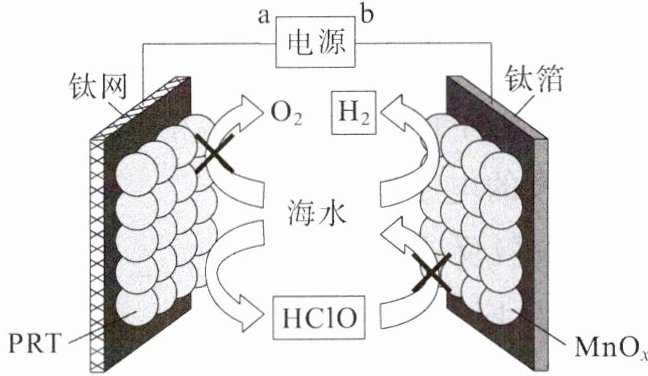 5. (2023·辽宁卷)某无隔膜流动海水电解法制${H_{2}}$的装置如下图所示,其中高选择性催化剂PRT可抑制${O_{2}}$产生。下列说法正确的是()