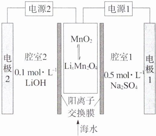 ② 关闭电源1和海水通道,启动电源2,使${Li_{x}Mn_{2}O_{4}}$中的${Li^{+}}$脱出进入腔室2。