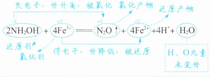 例2(2023·浙江1月选考)关于反应${2NH_{2}OH + 4Fe^{3+}\xlongequal{}N_{2}O\uparrow + 4Fe^{2+} + 4H^{+} + H_{2}O}$,下列说法正确的是(