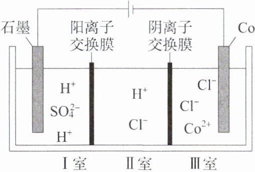 例2D 解析水放电生成的氢离子通过阳离子交换膜由I室向II 室移动,使II室中氢离子浓度增大,溶液pH减小,故A错误;阴极生成$1 mol$钴,阳极有$1 mol$水放电,则I室溶液质量减少$18 g$,故B错误;若移除离子交换膜,氯离子的放电能力强于水,氯离子会在阳极失去电子发生氧化反应生成氯气,则移除离子交换膜后,石墨电极的电极反应会发生变化,故C错误;电解总反应的离子方程式为$2Co^{2+} + 2H_2O \stackrel{电解}{ \longrightarrow } 2Co + O_2 \uparrow + 4H^+$,故D正确。