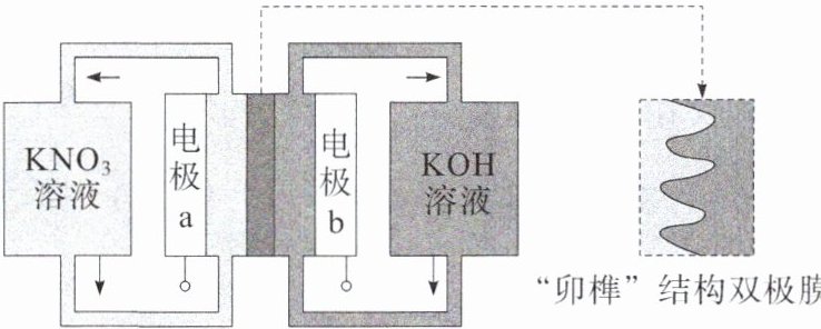 例3B 解析本题考查了电解原理、电解装置的分析及应用等综合知识。由信息大电流催化电解$KNO_3$溶液制氨可知,在电极a处$KNO_3$放电生成$NH_3$,发生还原反应,故电极a为阴极,电极方程式为$NO_3^- + 8e^- + 9H^+ \longrightarrow NH_3 + H_2O + 2H_2O$,电极b为阳极,电极方程式为$4OH^- - 4e^- \longrightarrow O_2 \uparrow + 2H_2O$。"暾樑"结构的双极膜中的$H^+$移向电极a,$OH^-$移向电极b。由分析中阴、阳极电极方程式可知,电解总反应为$KNO_3 + 3H_2O \longrightarrow NH_3 · H_2O + 2O_2 \uparrow + KOH$,A项正确;每生成$1 mol NH_3 · H_2O$,阴极得$8 mole^-$,同时双极膜处有$8 mol H^+$进入阴极室,即有$8 mol$的$H_2O$解离,B项错误;电解过程中,阳极室每消耗$4 mol OH^-$,同时有$4 mol OH^-$通过双极膜进入阳极室,$KOH$的物质的量不因反应而改变,C项正确;相比于平面结构双极膜,"暾樑"结构具有更大的膜面积,有利于$H_2O$被催化解离成$H^+$和$OH^-$,可提高氨生成速率,D项正确。