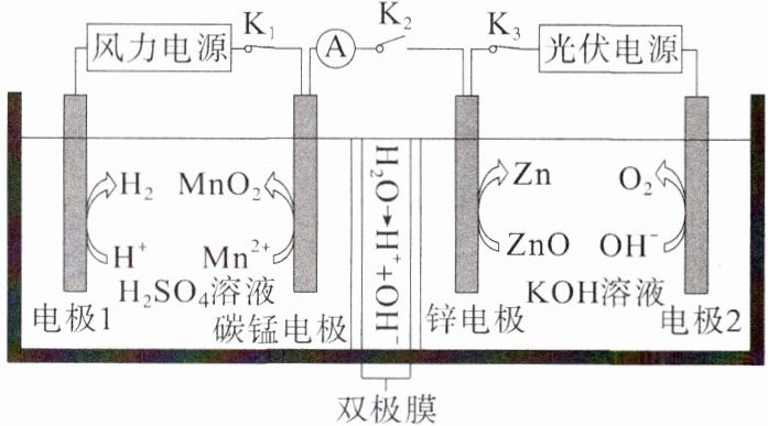 [对点训练3] (2023·辽宁大连模拟)为适应可再生能源的波动性和间歇性,我国科学家设计了一种电化学装置,其原理如下图所示。当闭合K₁和K₃、打开K₂时,装置处于蓄电状态;当打开K₁和K₃、闭合K₂时,装置处于放电状态。放电时,双极膜中间层中的H₂O解离为H⁺和OH⁻并分别向两侧迁移。下列有关该电化学装置工作时的说法不正确的是(