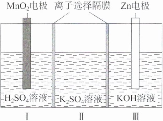 6. (2022·全国甲卷)一种水性电解液Zn-MnO₂离子选择双隔膜电池如图所示[KOH溶液中,Zn²⁺以Zn(OH)₄²⁻存在]。电池放电时,下列叙述错误的是()