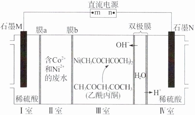 4. (2023·山西忻州一模)镍离子(Ni²⁺)和钴离子(Co²⁺)性质相似,工业上可通过电化学装置将废水中的Co²⁺和Ni²⁺分离,装置如图。已知Co²⁺和乙酰丙酮不反应,下列说法错误的是()