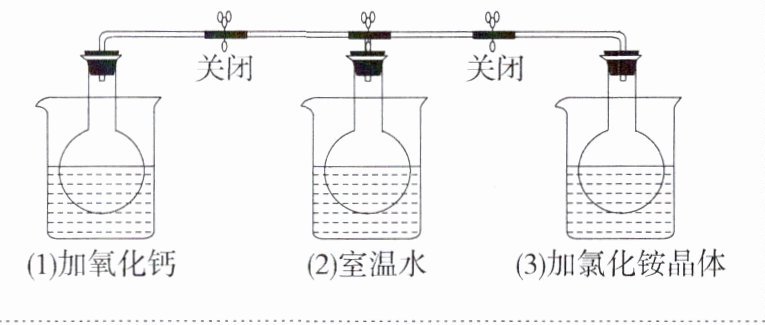 已知反应:${2NO_{2}}$(红棕色)$\rightleftharpoons {N_{2}O_{4}}$(无色)$\Delta H < 0$。如图所示,三个烧瓶中分别充满${NO_{2}}$气体并分别放置在盛有下列物质的烧杯(烧杯内有水)中:在(1)中加入${CaO}$,在(2)中不加其他任何物质,在(3)中加入${NH_{4}Cl}$晶体,则发现(1)中红棕色